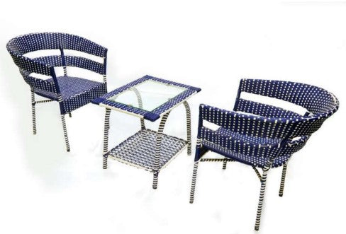 Blue and White Outdoor Furniture Set with Glass Table and Chairs